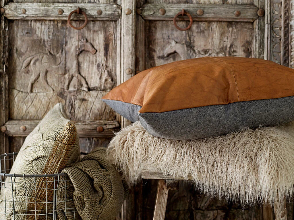 Il cuscino Lodge bifacciale nero e marrone di Södahl è progettato per interni eleganti e moderni. Sorprende per la combinazione di materiali, in quanto è cucito con pelle e lana.